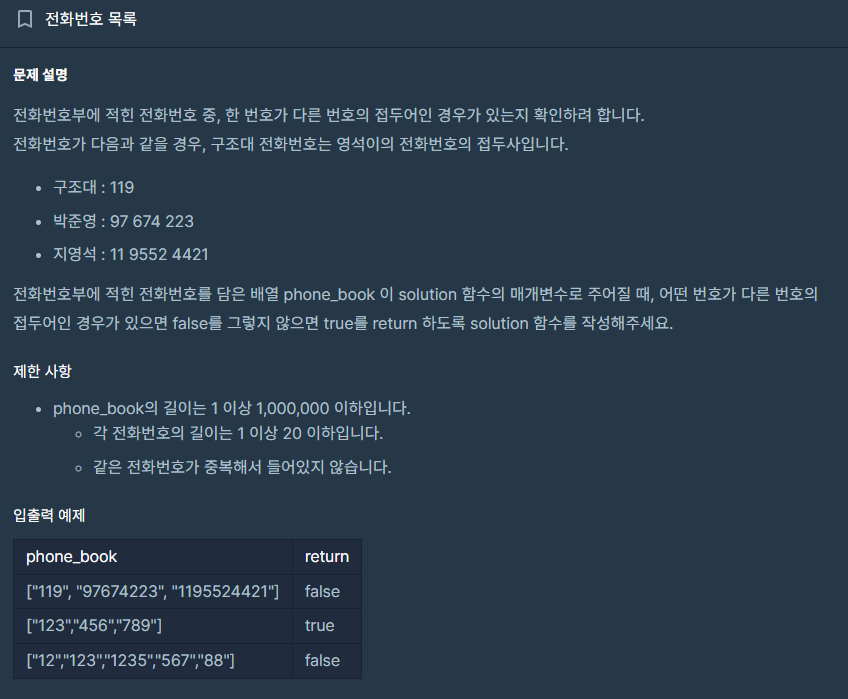 프로그래머스 고득점 Kit 해시 분류의 "전화번호 목록"이라는 문제입니다.
