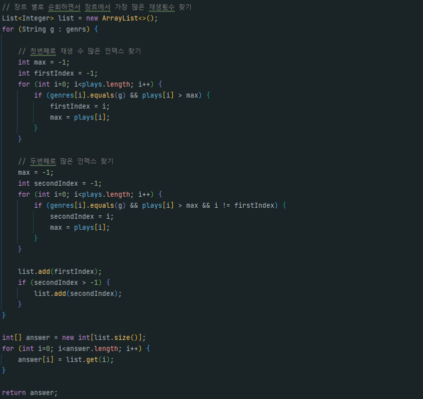 특정 장르에서 재생횟수가 많은 부분을 찾는건 조금 더 좋은 코드로 쓸 수 있을 것 같습니다. 코드의 중복 제거도 그렇고 무엇보다 저렇게 할 경우 O(n2) 시간복잡도를 갖기 때문에 좋은 코드는 아니고 이런 방법으로 접근하면 이해하기는 쉽다의 의미가 있는 코드로 보시면 될 것 같습니다.