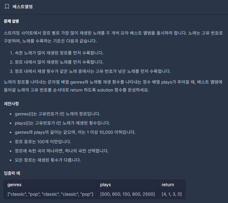 프로그래머스 고득점 kit 해시 카테고리의 레벨 3 문제 "베스트앨범" 이라는 문제입니다.