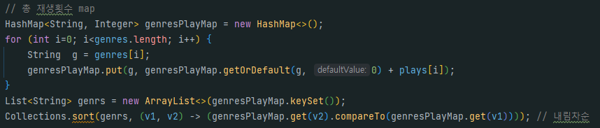 2. 인기있는 장르부터 선별하기 위해 내림차순 정렬이 필요하기에 List정의, 람다식을 활용해 재생횟수 기준으로 내림차순 정렬