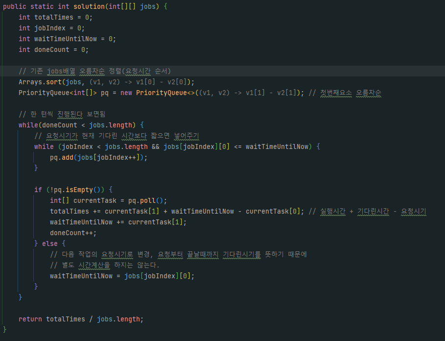 1. 각각 요청온 순서대로 job 정렬, 빨리 끝나는 순서대로 우선순위큐 정렬