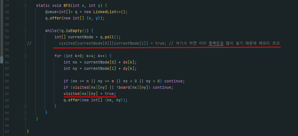BFS 코드의 일부분인데 위에 주석처리를 해놓은 것처럼 q에 이미 넣은걸 빼면서 방문처리하게되면 다음껄 q에 넣는 동시에 방문처리 하는 것과 비슷해보이지만 해당 케이스가 많아진다면 q에 들어가는 양이 많아지기 때문에 메모리 초과가 발생할 수 있습니다.