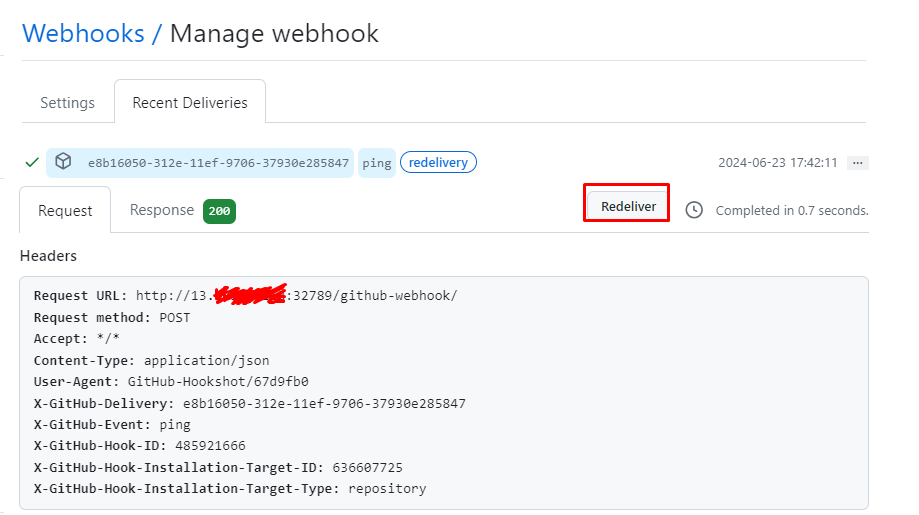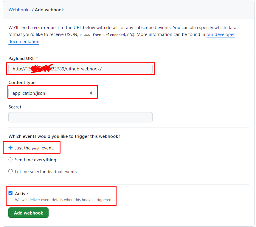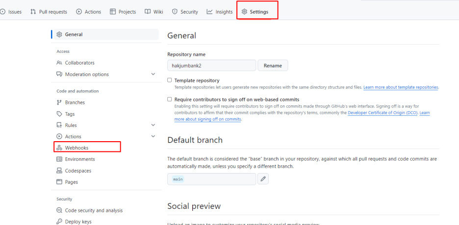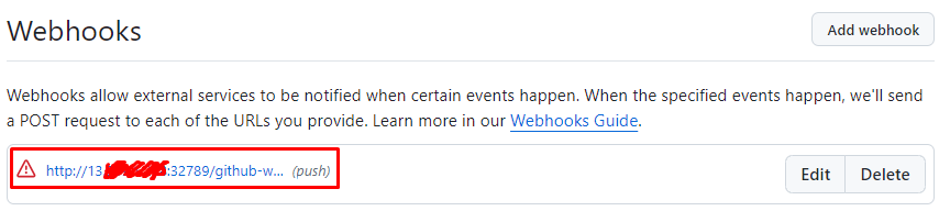 본인의 프로젝트 레파지토리 -> Settins -> Webhooks -> add webhook
