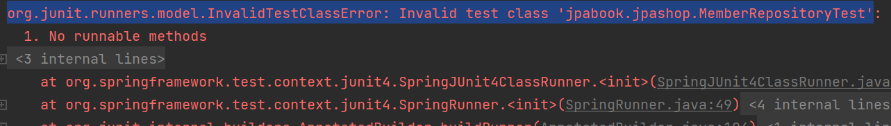 org.junit.runners.model.InvalidTestClassError: Invalid test class 'jpabook.jpashop.MemberRepositoryTest'