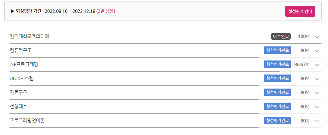 저의 경우 게으른 직장인이었기 때문에 과제나 시험 1주일 정도 전에 시간투자를 하는 편이었고 그 결과 과락만 면하거나 한두과목은 과락일수도 있지 않을까 싶습니다. 기말시험 점수 배점이 높기 때문에 기말때 직장인 기준 최소한 2주는 잡고 투자해야하지 않을까 싶습니다.