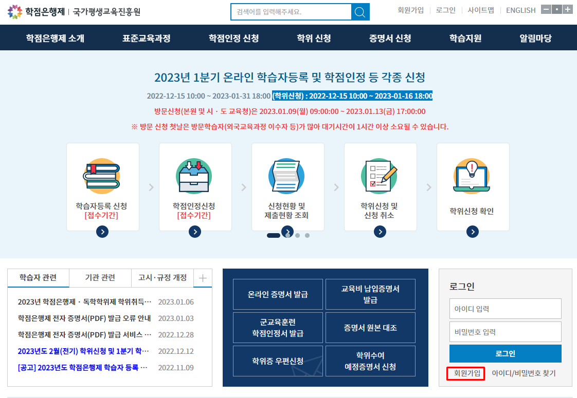 아래 링크를 통해 접속하거나 검색 시에는 "국가평생교육원 학점은행제" 라고 검색해주시면 됩니다. 단순히 국가평생교육진흥원으로 검색해서 나오는 사이트랑은 다른 사이트입니다.