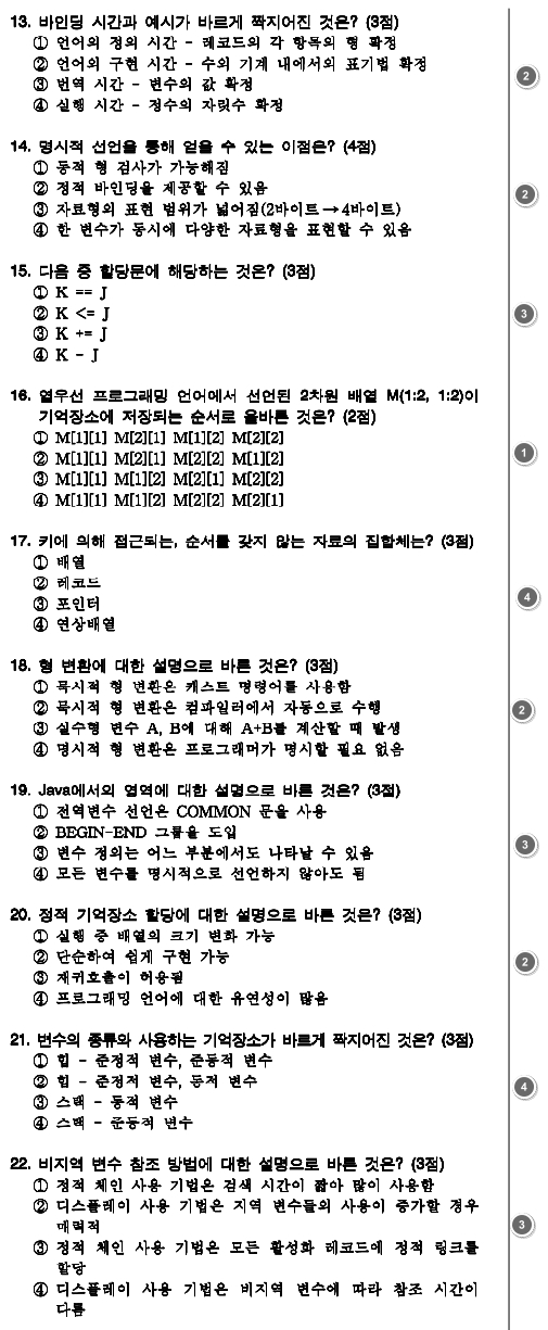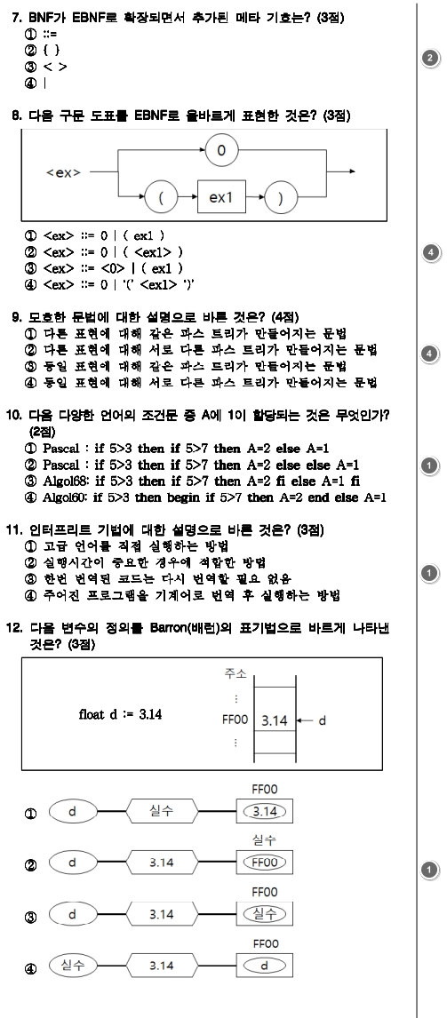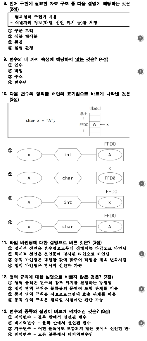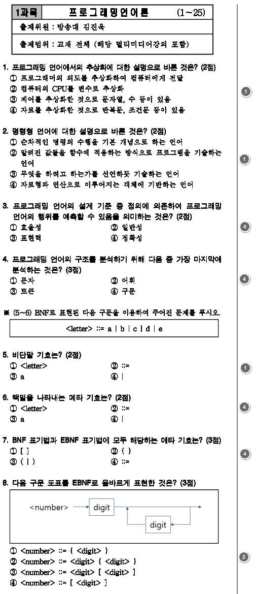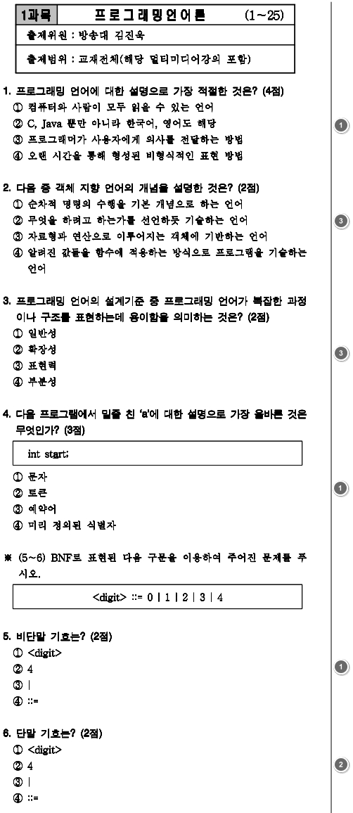 한국방송통신대학교(방통대) 컴퓨터과학과 프로그래밍언어론 기말 기출문제 문제와 정답입니다. 공식 홈페이지에 있는 내용에서 정답까지 피시나 모바일로 조금 더 쉽게 확인할 수 있게 합친 것입니다.