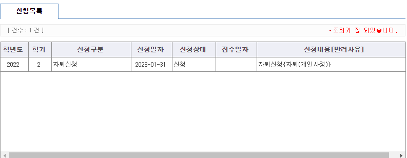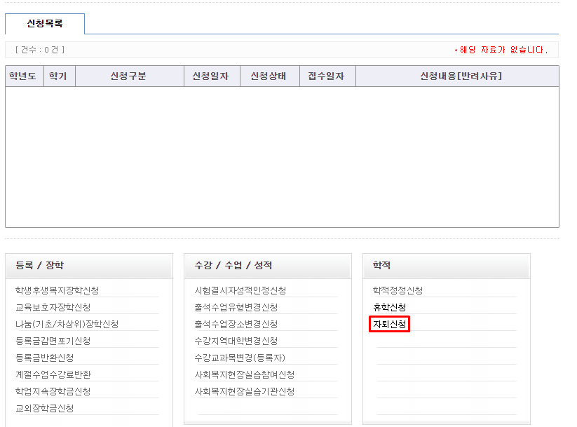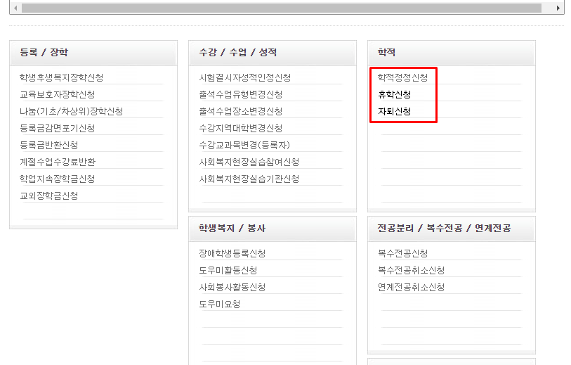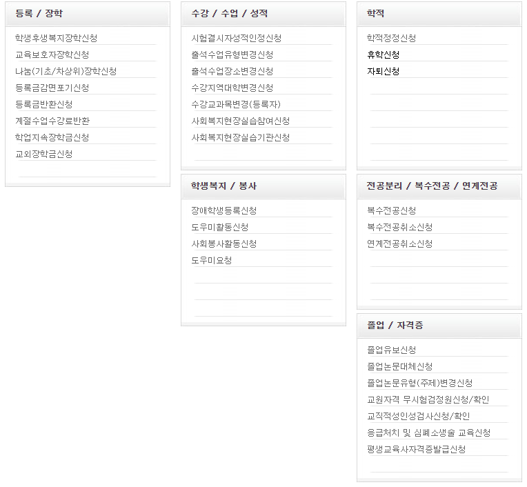 그 외에도 복수전공신청, 연계전공, 졸업유보, 졸업논문대체신청 등 학교를 다니면서 필요한 거의 모든 신청이 있다고 보시면 될 듯 합니다.
