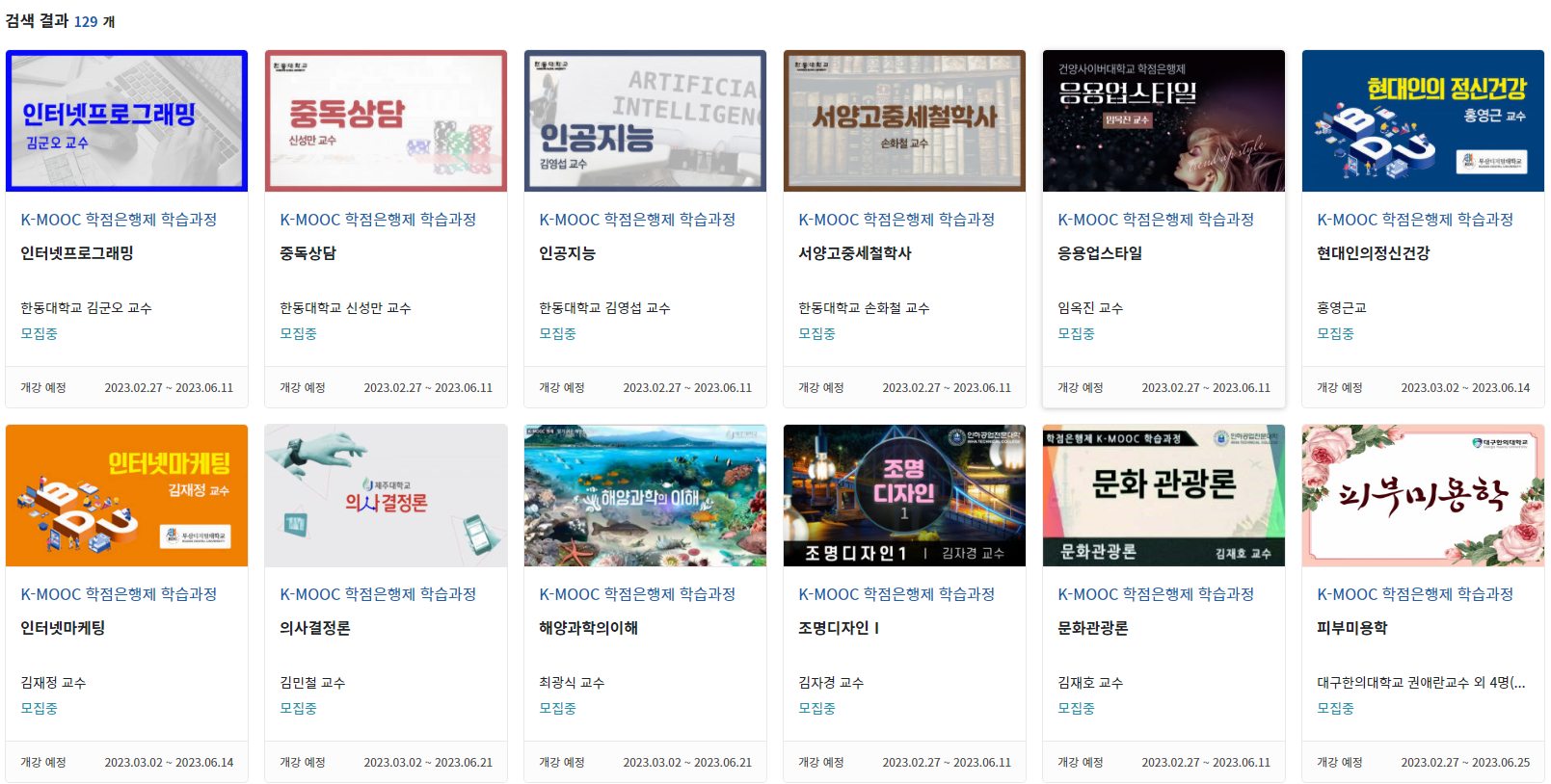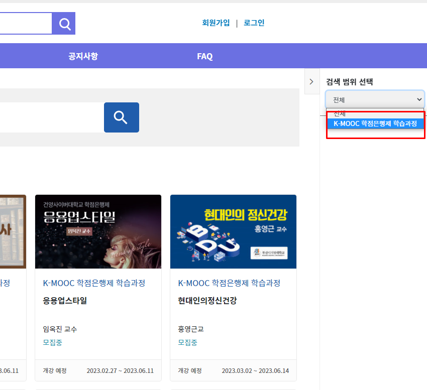사진과 같이 K-MOOC 학점은행제 학습과정을 선택해서 수강 가능한 과목이 있나 봐야한다.