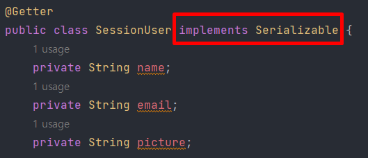 결론부터 말하자면 직렬화를 구현해줘야하는 상황이며 User엔티티를 SeesionUser클래스를 만들어 엔티티와 세션을 위한 엔티티 분리하고 직렬화를 해주면서 아래와 같이 간단하게 해결이 가능하다.