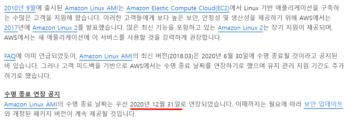 책에서는 Amazon Linux 1 AMI 인스턴스를 생성했으나 aws 측에서 2020년 6월 30일까지로 공고한 바 있습니다. 현재는 2 버전으로 만들면 되고 2023 AMI 버전으로 설치시 프로젝트에 사용된 8버전 자바 설치에 어려움이 있습니다.
