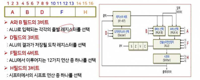 왼쪽 그림(제어단어)의 AB, D, F, H가 무슨 역할을 하는지를 파악하고