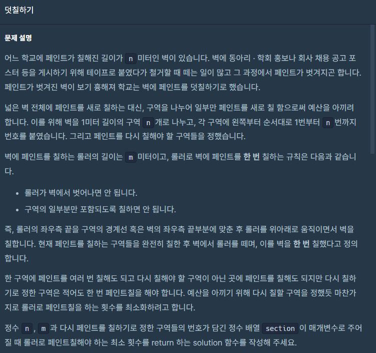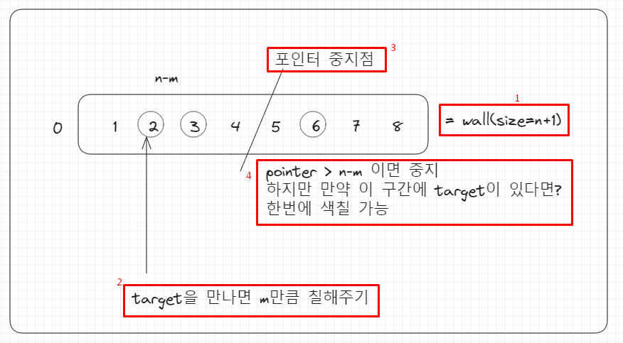 한번에 페인팅해야되는 길이가 m이고 이 길이만큼 무조건 칠해줘야하기 때문에 칠해줍니다. 왼쪽에서 시작해서 나아가는 반복문을 사용하여 간단하게 만들 수 있습니다.