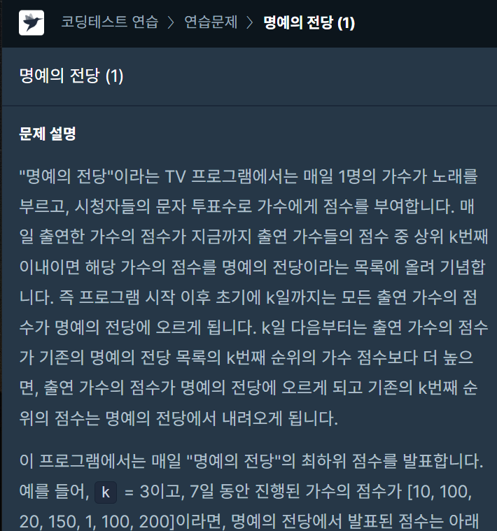 [프로그래머스][L1] 명예의 전당 자바 문제 풀이 및 정답
