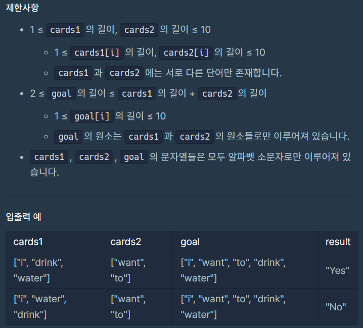 카드 뭉치가 두 개만 주어진다는점과 goal은 카드 뭉치 안에 있는 단어에 무조건 포함되거나 길이가 카드 뭉치 합친거보다 작거나 같다 등 주어지는 조건을 고려하면 단순히 hashmap을 두 개 만들어 풀면 어렵지 않게 풀릴 수 있습니다.