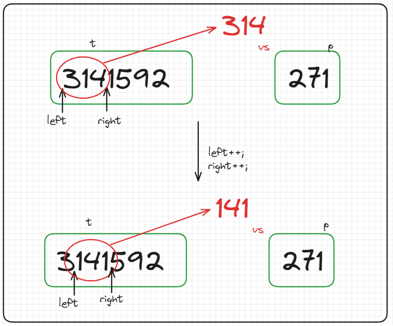 left, right에 각각 인덱스를 지정해 한칸씩 밀어가면서 숫자를 만들고 만든 숫자를 주어진 숫자와 비교합니다. 슬라이딩 윈도우라고도하는데 박스를 밀어가듯이 풀어나갑니다.