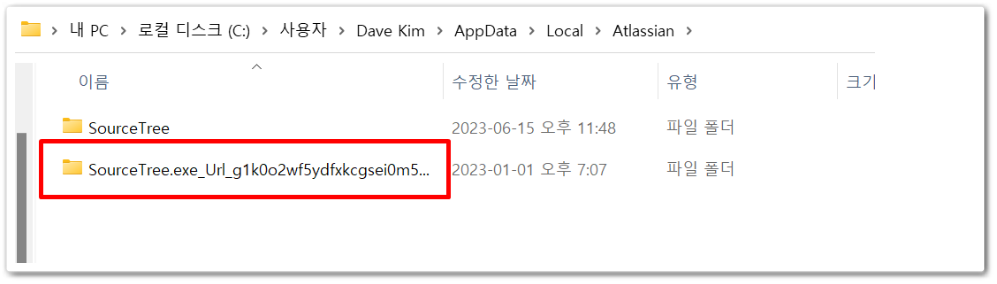 (내 PC -> 사용자 -> PC에 설정된 유저 네임(저의 경우 Dave Kim) -> AppData -> Local -> Atalassian)