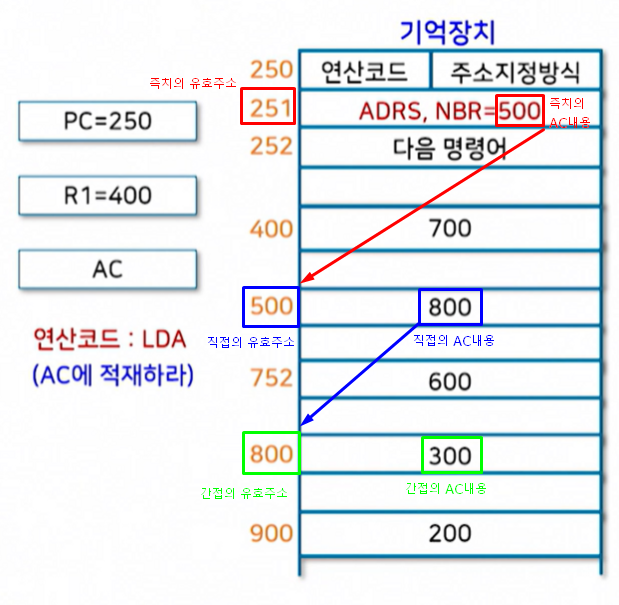 그대로 가게되면 500이라는 껍데기값을 찾습니다 그림과 같이 500이 유효주소 알맹이 값이 800이기에 직접주소방식으로 봤을 때 유효주소는 500, AC내용은 800이 됩니다.