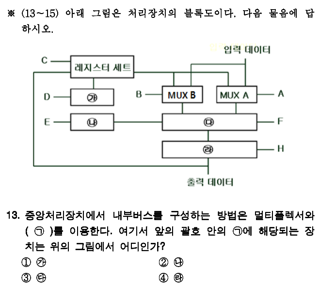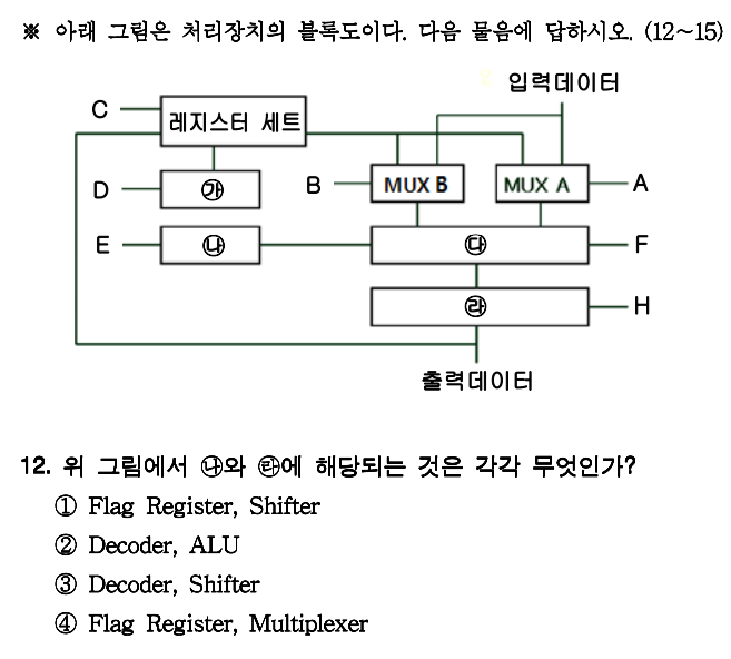 2018 기출을 보다보면 위 그림과 약간 다른 처리장치 블록도가 나오게되는데, 저 E부분에 해당하는 것은 임시 보관하는 녀석입니다. Flag register라고 부릅니다. D와 E가 약간 헷갈릴 수 있는데 D는 디코더로 마지막 도착 레지스터를 결정하는 녀석이며, E는 보관만 하는 역할이라고 보시면 됩니다.
