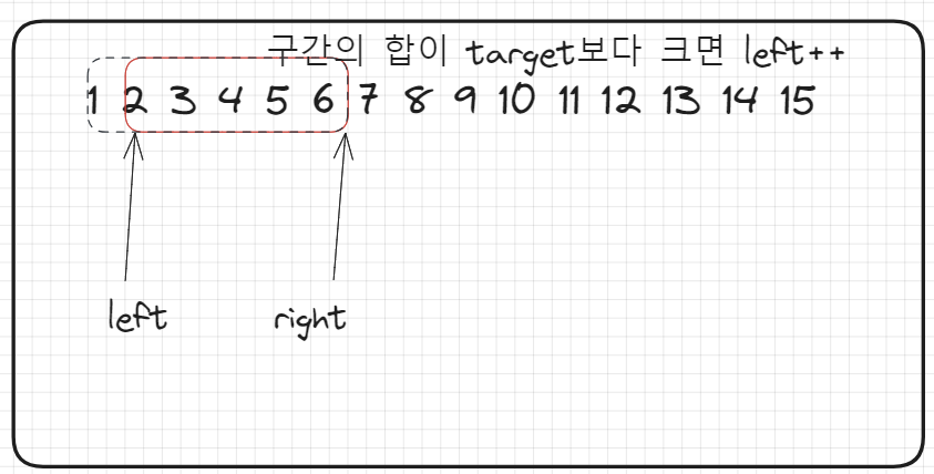 해당 문제는 가변적인 크기를 가지기 때문에 투포인터라고 명명하는 것이 맞겠고 위 방식으로 접근 했을 경우 배열은 아니지만 배열과 같은 자연수들을 left, right 포인트 기점으로 한 번 훑고 지나가기 때문에 O(n)의 시간복잡도를 가지게 됩니다.