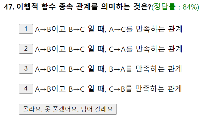 A->B이고 B->C일 때, A->C를 만족하는 관계를 이행적 함수 종속 관계라고 하며