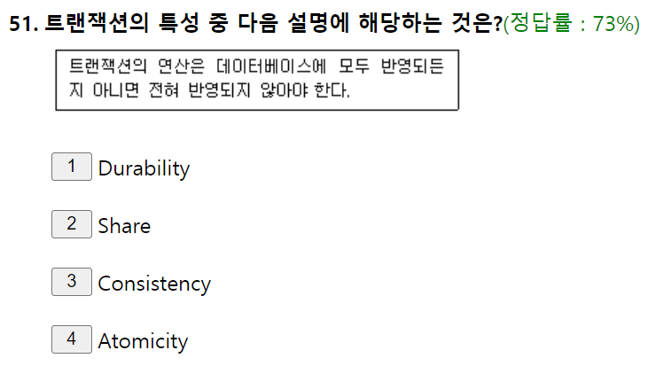 영속성(Durability) : 성공적으로 완료된 트랜잭션 결과는 시스템이 고장나더라도 영구적으로 반영되어야 한다.