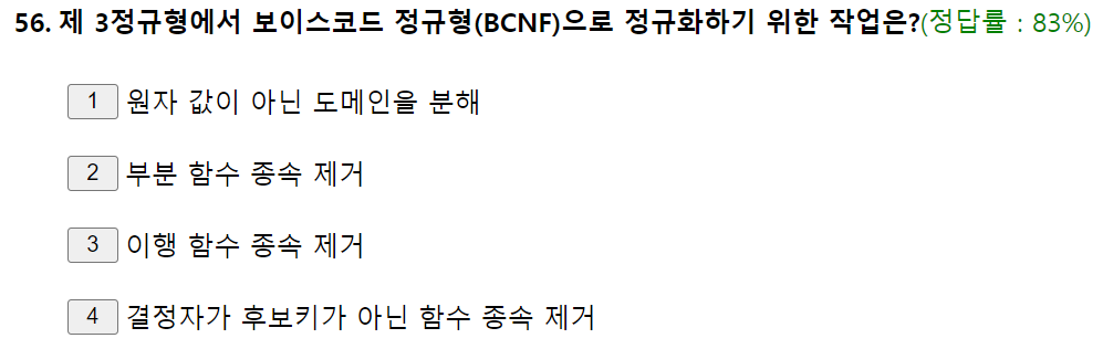 제3정규 -> BCNF : 결정자이면서 후보키가 아닌 것 제거 필요