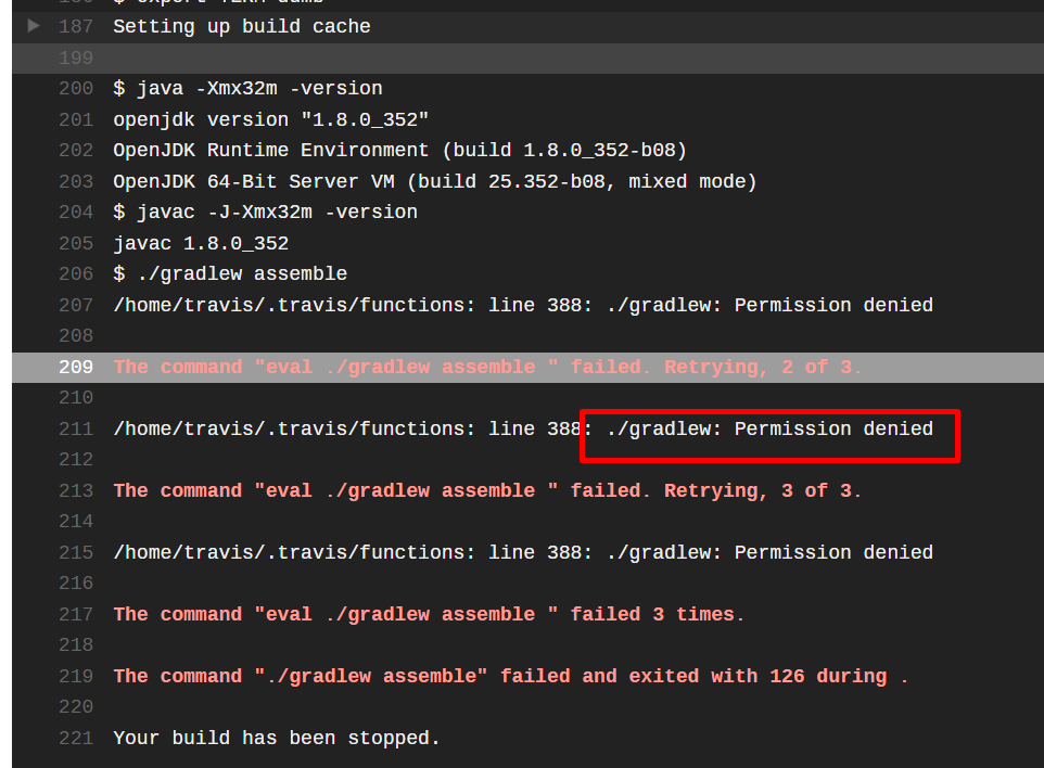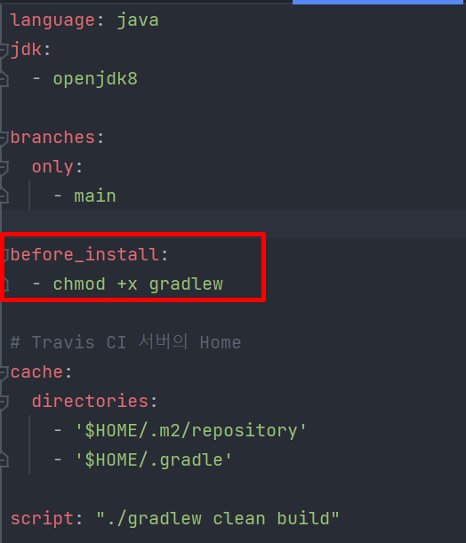 .travis.yml에 chmod +x gradlew 부분을 추가해줬다.