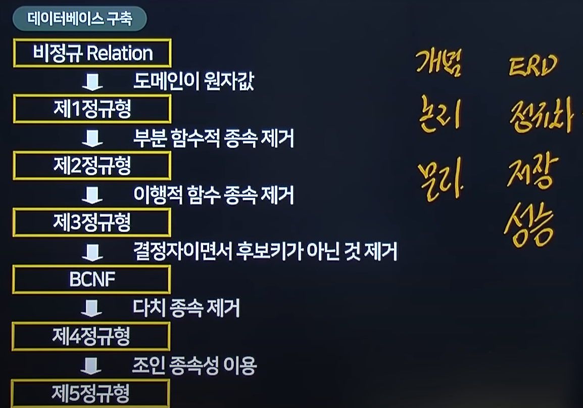 요구사항 분석 -> 개념적 설계 -> 논리적 설계 -> 물리적 설계 단계로 데이터베이스 설계가 진행되며 논리적 단계에서 정규화라는 것을 하게되는데 각각 위 키워드로 몇단계 정규화를 진행하는지 알 수 있다.