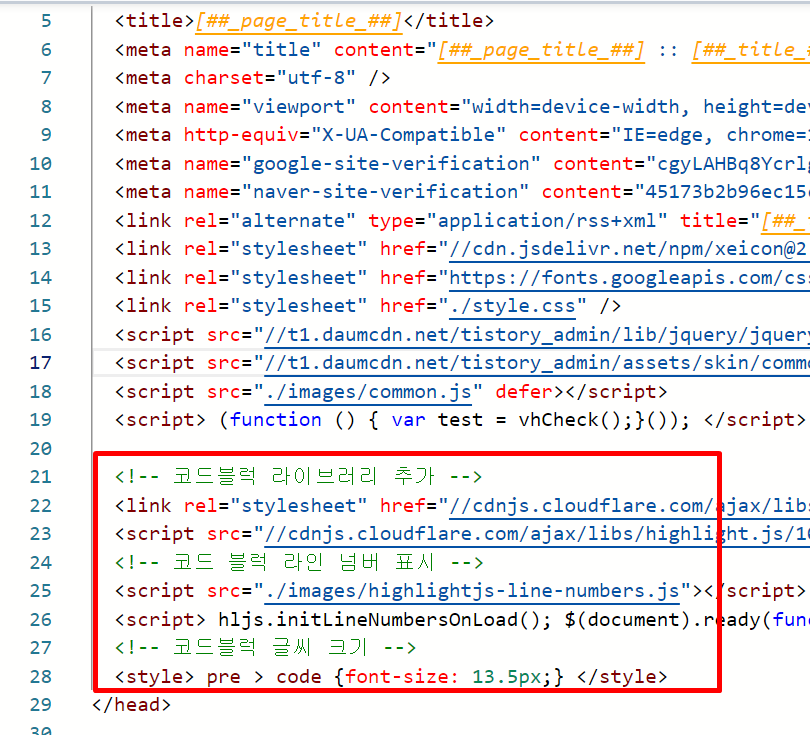경로로 들어가서 <head> </head> 태그 사이에 아래 문구를 넣어주면 끝입니다.