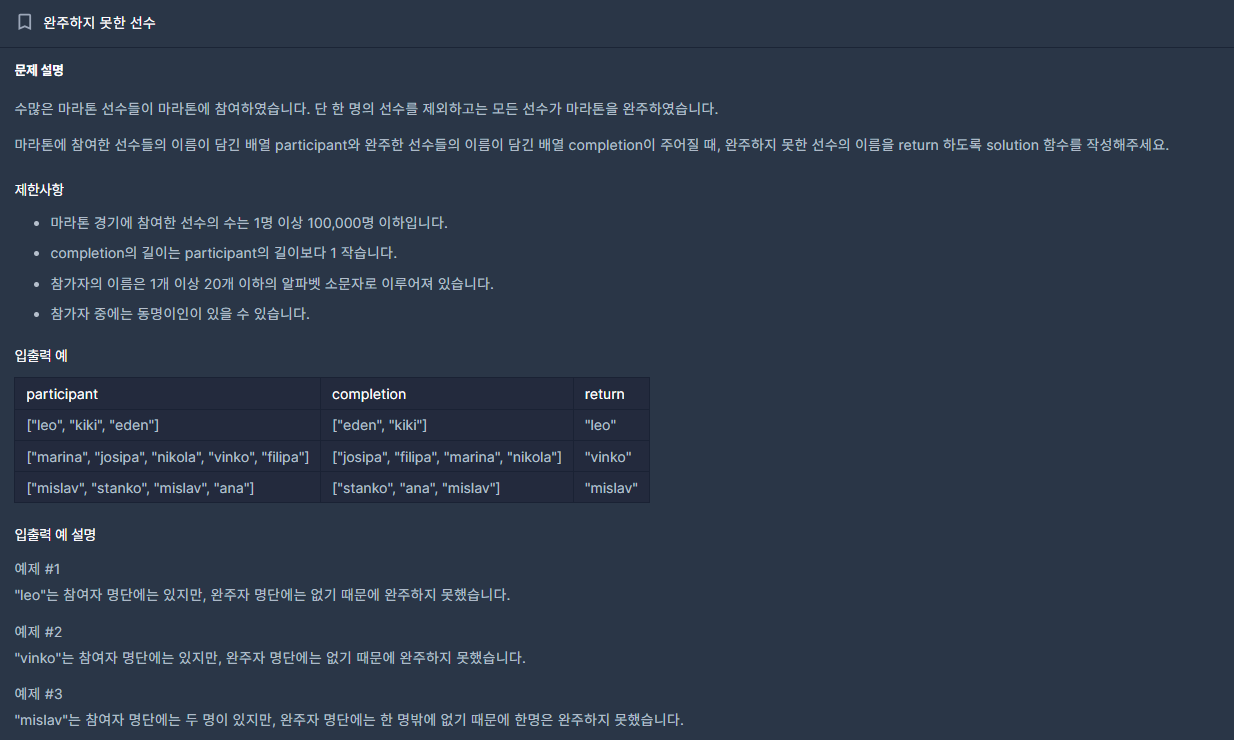 - 완주하지 못한 선수 이름을 반환하는 함수 작성