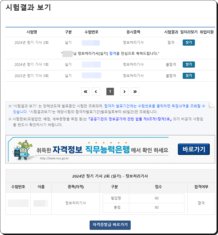 관련글정보처리기사 필기 요약 총 정리, 필기 합격 팁 정보처리기사 3회만에 최종합격2023년 3회차부터 시작해서 2024년 1,2회차 시험을 치뤘습니다. 2024년 2회차 시험을 마지막으로 최종적으로 정보처리기사 실기까지 붙었습니다. 실기 시험은 바로 결과가 나오지않고 40일 뒤 정도에 나오게되는데 가채점을 해보니 그래도 안정권에 들어가는 것 같더라구요 필기는 한번에 붙기는 했지만 실기 시험은 생각보다 고전했습니다. 방심을 한 것도 있는 것 같고 제가 문제를 푸는 스타일이 그렇게 꼼꼼하지 않았고 시험 유형에 맞춰 깔끔하게 붙는데 1년이나 걸렸습니다. 시험점수는 최종 결과가 나온뒤에 업데이트 하도록 하겠습니다.(발표된 최종 점수 나와서 맨 마지막에 추가했습니다) 정보처리기사 실기 난이도?앞서 본 두 번의..