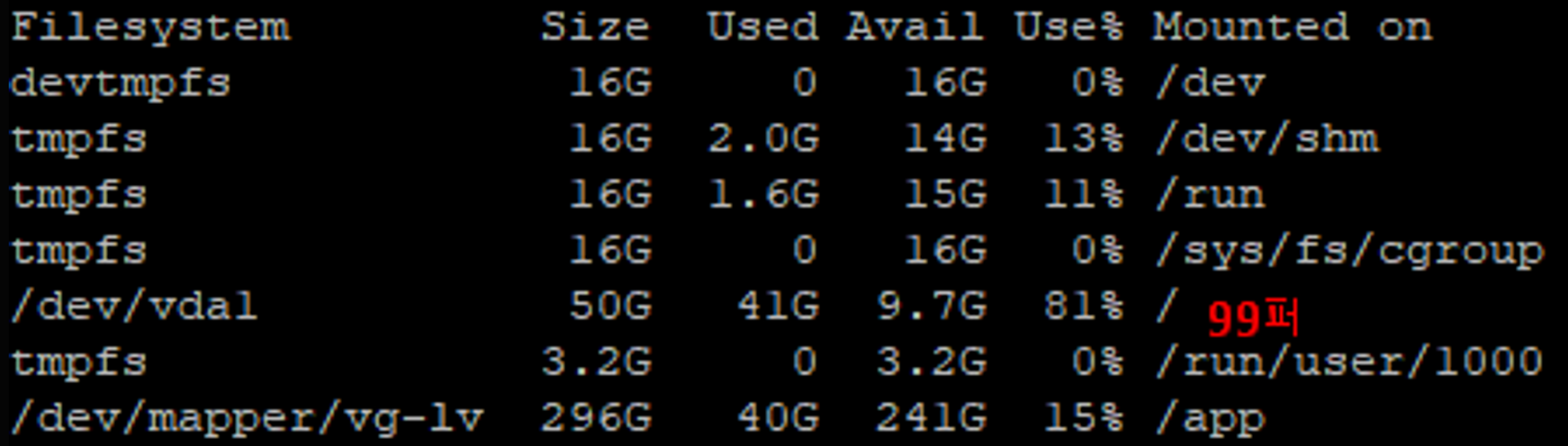 Free disk space is less than 5%~~ 와 같은 알림이 왔다. 오류는 아니지만 가만 두면 오류가 생길 수 있기 때문에 관련해서 서버 문제가 생길 수 있기 때문에 바로 문제를 찾아보기 시작했다. (환경은 centOS 7버전) 1. 원인 탐색 df -h 명령어를 통해 확인하니 추가된 스토리지 볼륨 그룹이 아닌 기본 스토리지 영역에 500메가 밖에 남지 않았었다(지금은 해결해서 줄어든 상태) 어떨때는 100메가로 줄어들기도 하고 1기가로 늘어나기도 했었는데 다른 공간 여유는 있지만 필요한 특정 공간 여유가 없어지면 어떤 것이든 문제가 생길 확률이 매우 높기 때문에 더더욱 빨리 해결을 해야했다. 추정 원인들은 다음과 같았다. 로그파일 (특정 로그가 쌓여서 용량 부족) 스왑메모리 (자원이 부..
