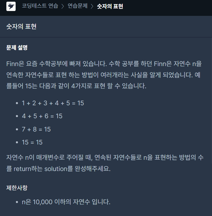프로그래머스 레벨2 숫자의 표현 문제입니다.